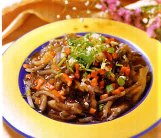 水发鱼皮300克、生姜、葱各10克、香蒜杆10克,花生油50克、盐10克、味精10克、胡椒粉少许、清汤50克、麻油5克、料酒10克、蚝油5克休 闲 居 编辑