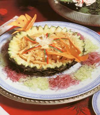 3、炒菠萝丝、鸡丝、酸甜菜丝、嫩姜丝,加入盐和花生酱等调味,放入果壳内,撒下白芝麻,饰以红椒丝等即可。