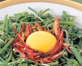 2. 锅中倒入A料烧热,放入姜丝炒香,再放入龙须菜及B料快炒,盛入盘中,中央放入红辣椒及生蛋黄,食用时再拌匀即可。