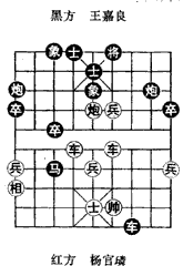 如图是杨官?U对王嘉良弈完29回合时的形势,轮到红方走。此时有助有帅车兵同线,潜伏三把手杀势,红决定弃黑方王嘉良左车砍士,以保证小兵冲入九宫攻杀,着法如下: