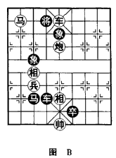 如图B ,红方双车与马炮配合,用著名的“海底捞月”杀法,逼黑落士,而后用车取胜。