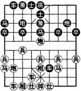 如图所示,黑方子力比较活跃,有一定的反击能力。此时红方上相打车,黑方乘机弃车砍炮, 抢先取势,打开局面,扩大攻势。黑方先行: