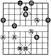 此局是1985年全国个人赛女子棋手广东黄子君和上海单霞丽弈成的残局。如图形势,红虽已无士相,但双马一炮位置很好,黑方单缺象,一车难抵三子。红以逐步紧逼的战术获胜。