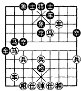 如图所示,黑车正在威胁红马,红方如飞相吃炮,简单兑子之后,双方和势甚浓。实战中,红方巧妙运子,造成黑方阵形出现缺陷,终于获得胜利。(红先)
