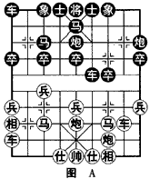 图A是1984年“昆化杯”大师邀请赛中,上海胡荣华与黑龙江赵国荣夺完第11回合时形势,双方是由中炮进七兵对三步虎布局。双方大子相等,黑方多一卒,但黑方的弱点是窝心马。红方抓住黑方这一弱点,先是弃马扩大优势,最后弃车杀仕取得胜利。着法如下: