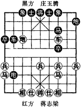 如图所示,双方互相牵制,红方有多兵的优势,在时间的延续下,红方比较有利。黑方如何 发挥子力比较灵活的优势,是目前的要点。在深入分析的情况下,黑方采用了兑子争先的战术,终于取得了优势。黑方先行: