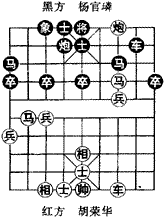 如图是胡荣华对杨官?U弈完21回合时的形势,轮到红方走。此时沉底炮有被黑退车捉死的危险,但红决意弃炮,迅速出车攻击: