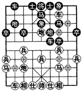 如图,是1993年第三届世界锦标赛,香港赖罗平对纽约谭正弈完第11回合时的形势。由中炮对反官马布局演变而成。现在轮红方走子,采用一车换双战术,控黑窝心马攻杀夺胜。着法如下: