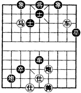 黑胜 黑卒下底包抄形成杀势。以下红如士六退五,则卒4平5!帅四平五,车7进1杀,黑胜。以上黑车炮卒左右夹击杀法精妙。