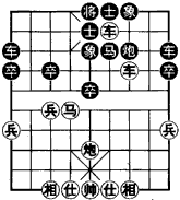 如图是1974年全国个人赛胡荣华对徐天利弈完18回合时的形势。虽然双方大子相等,但红子全部投入进攻,黑缩守挨打,局面是一面倒之势,现在的问题是,红方如何以闪电战术迅速谋子得势,从而奠定胜局。着法红先: