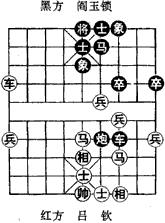如图是吕钦对阎玉锁弈完27回合时的形势,轮到红方走。如逃马三退二,炮6平9,马五进六,马6进8,红一时难以发展攻势。于是红决定跃马过河咬象,弃马取势,着法如下: