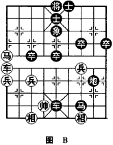 如(图B),黑弃车入局,红如帅六平五,则炮8进2杀。如帅六进一,则黑马7退6杀,如帅六退一,则车5进1,帅六进一,炮8进2,帅六进一,车5平4黑亦胜。