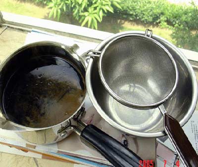 水烧开,将龟苓膏糊慢慢拌进去,使完全溶解。(据说用开水直接冲也可,但我总是拌不均匀)