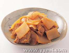 (4) 在煮的萝卜中放牛肉﹑香菇﹑石耳﹑生姜﹑辣椒丝放佐料炖熬。休 闲 居 编 辑