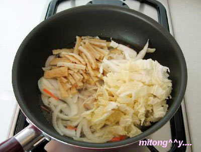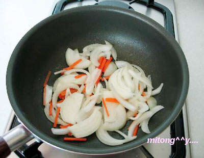 洋葱、紅萝卜稍微爆香一下就好(別炒到熟唷)接著倒入適量的水,水量是一杯(年糕的量是一人份約20小條)