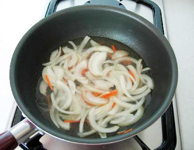 一般炒年糕不用油炒是用水煮而成的,把他改成先用少许油把洋葱、红萝卜爆香
