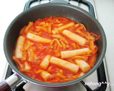 煮至水滚加上适量的韩式辣椒醬,我的韩式辣椒醬是帶甜味的。所以不需再加糖,如果用的是原味的韩式辣椒醬就要加糖唷:) 因為辣炒年糕吃起來要甜甜辣辣的才好吃!