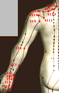 位置:在肩关节后下方,臂内收时,肘后纹头上1寸(指寸)。