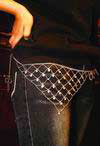 不管是不是低腰的,也总会被看得到,它有一个大大的三角形网状吊链,腰链的美就在它了。戴腰链,那块三角形的吊链一定不能戴在正下方,视觉效果会很不雅。常见的戴法是把它转到腰的一侧,髋骨旁边。这种有吊链的腰链多是由金属、水钻制作的,特别闪亮,配深色的裤子比较好。