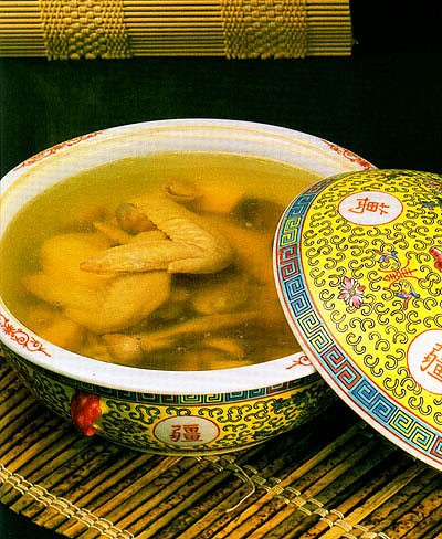 4、将鸡、当归(最多两个归头,最好切片)、黄芪(与当归齐量、最好切片)一起放进砂锅内,加入清水5碗,大火猛烧,汤滚后15分钟,调至文火,2小时汤成即可饮用。