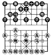 这步棋一般多走马八进七,黑如马8进9,红再车二进四或兵三进一,可持先手。如图形势,红方平炮是一步带有欺骗性的攻着。对此,黑方主要有两种应着:(甲)车4进3;(乙)象3进1。现分述如下: