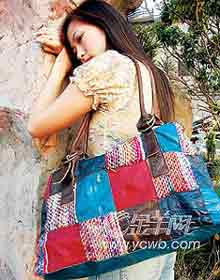 用红、蓝、咖啡三种颜色的洗水皮和同色系的毛线麻织布拼成,颜色对比强烈,绚丽多样,不管手提还是单肩背都女人味十足。价格:900元。