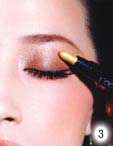 2.选定与肤色融合的浅棕色系珠光眼影,在眼褶皱处上色,并由眼皮的中间向眼尾、再由眼窝的方向刷向眼尾并刷匀,若涂抹太厚重,可以手指轻轻推散,这样会比较自然。颜色比较深的眼影是整个眼妆的重点部分,将可以与浅色系作搭配的深金棕色眼影棒先于手背上稍稍搽过,让上妆更加均匀,然后将其涂抹于上眼睑处呈半圆形,并用刷子由睫毛根部向眉骨呈放射状扫开。