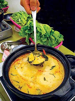 待咖喱煮至差不多要粘住镬底时,加入椰浆或牛奶,材料一湿,又要再继续炒,炒至半生熟,把镬里的材料转放进一个锅中,再加大量的椰浆或牛奶进去煮,煮至全熟为止。怎么样才知道熟了没有?用筷子去插呀!一插就插得进去,表示已经熟透了。