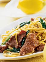 4.炒锅入油,下牛肉片翻炒,七成熟加入芥兰、红椒和沙茶酱一同翻炒,然后放入面条,翻炒后即可出锅。