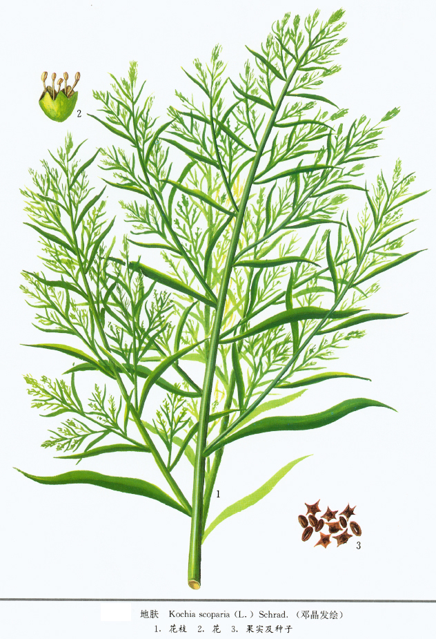【植物形态】地肤(《本经》),又名:箭、王蔧(《尔雅》),王帚(《尔雅》郭璞注),扫帚(陶弘景),涎衣草(《唐本草》),鸭舌草、独帚(《本草图经》),白地草(《纲目》),黄蒿(《本经逢原》),地面草。