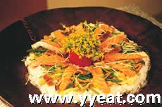 (5)把所有的材料以放射状,或任何你喜欢的形式一层层均匀地铺放在寿司饭的上层四周,就是一盘丰盛的BARAZUSHI(散状的寿司)。