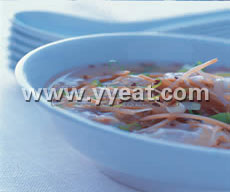 (2)将水入锅煮沸,再放入云吞,煮至浮起,就可以将牛蒡丝罐头、汤汁及葱花放入,试一下味道,如果咸度不够,可再加入少许盐,等汤略滚一下就可以盛出食用。休 闲 居 编 辑
