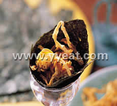 (2)将海苔片对角斜切成4等份,捲成冰淇淋筒状,包入炸好的面条及鳕鱼香丝即成。 休闲居编 辑