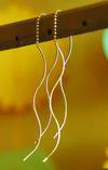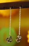 两根长度不一的细长银线,都发端于耳针,长的那根银线一端系着吊坠,稍短的那根系的是耳针的扣子。耳针穿进耳洞,搭上扣子,就形成一个半圆。看上去,就像是把一个长线耳环和一个半圆耳环戴在一起。而且这样,就不用担心扣子老是不小心掉了。