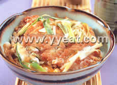 5.准备一人份的白饭,放入大碗中,再把作法4的材料倒在白饭上,撒上少许葱丝,即完成胜丼。