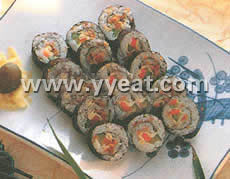 3. 海苔皮放于竹帘上,铺上一半的饭摊平,中间放入材料2后,用力将竹帘捲紧。