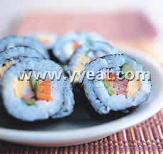 4.将一片寿司海苔放于寿司捲帘上,寿司饭铺满压平在整片海苔上,再放上作法2与作法3的材料,捲起寿司捲帘并用力压紧,取出切块即可。