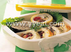 (2)将竹帘上铺保洁膜1张,先将寿司饭置于中央均匀铺平,左右各留1公分边,尾端留3公分,依序将所有材料铺在饭的中央,提起前端向另一端压紧,并用竹帘捲好固定,一边拉紧,两头压紧,再取下竹帘。切成八等分备用。