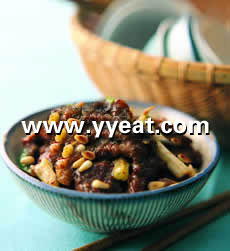 (2)起油锅爆香葱段,随即放入牛肉片拌炒至全熟,再倒入松子仁略拌匀即可起锅。