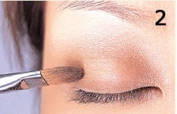 2.使用小眼影刷沾取咖啡色眼影,沾取时如果怕一次沾取太多,可以先在面纸上沾掉一些眼影粉,才不会第一笔就刷上过重的颜色,将眼影涂刷在上眼皮眼睛闭起时的凹陷处,强调凹陷感。