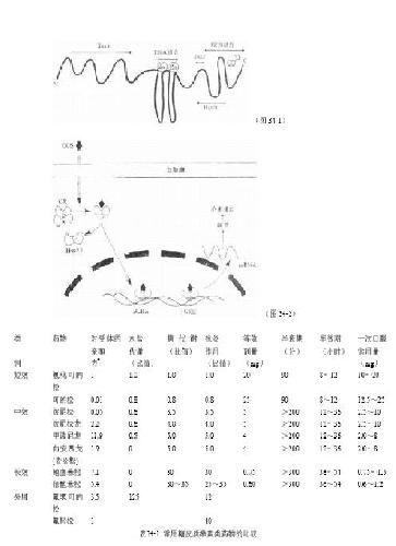 未活化的G-R与一大分子(约30kDa)蛋白质复合物相结合,该复合物含有两个热休克蛋白90(heat shock protein 90,Hsp 90),其C端与受体相结合;该复合物可能还结合有其他蛋白,如抑制性蛋白等。一旦GCS与G-R结合,Hsp 90被解离,则被活化的GCS-G-R复合物迅速进入核内,进而与靶的基因的启动子(promoter)序列的糖皮质激素反应成分(glucocorticoid response element,GRE)或负性糖皮质激素反应成分(negative glucocorticoid respones element,nGRE)相结合,相应地引起转录增加或减少,继而通过mR-NA影响介质蛋白合成(图34-2)。
