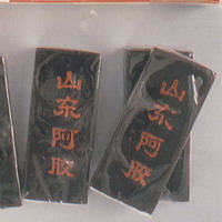 为马科动物驴的皮经煎煮、浓缩制成的固体胶。以山东省东阿县的产品最为著名。捣成碎块或以蛤粉烫炒成珠用。