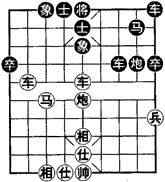 [棋例]1960年10月广东对上海友谊赛中,胡荣华对蔡福如,双方以飞相对有中炮布局,弈至第24回合形势如图。双方互以双车马炮对峙,似乎平静。但红方子力位置优越,实战中采用了兑车简化局势的技术手段,“明修栈道”,又用车“暗渡陈仓”