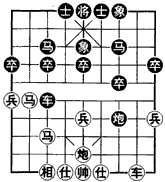 (棋例) 1977年2月,香港鲁钟能对广东杨官?U弈至19回合时形势如图,红方缺相少兵不易久战,准备平炮打车集中子力进攻黑方右翼。黑方则利用抽换对方子力,削弱对方实力的“偷梁换柱”之计,把优势变为胜势,取得胜利。实战着法如下: