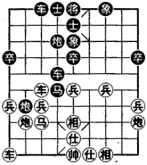 (棋例) 1984年全国团体赛,湖南王定中对四川蒋全胜,双方以顺炮横车对直车布局,弈至第17回合时,形势如图。双方大子均等,红万多两个兵。现轮黑方行棋,巧弃中卒,进马卧槽,实施“笑里藏刀”之计,取得胜利。实战着法如下: