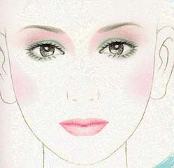 以亮色和浮起处的阴影涂刷亮色至超出眼窝范围,然后刷晕至眉下,此外下眼睑也刷晕成如围住眼睛一般,至于暗色则是又细又淡地涂刷于睫毛边际处。