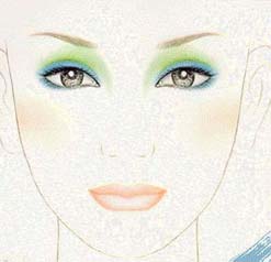 色彩搭配:蓝色配橙黄色、银白色,热烈而生动;绿色配鹅黄色、樱桃红,妆色显得热烈而妩媚;紫褐色配玫瑰红、橙黄色、蓝白色,妆色显得热烈而高雅;蓝色配玫瑰红色、鹅黄色、银色,妆色艳丽而高贵。