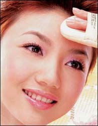 2.与肌肤完美结合:用粉扑轻按额头、将粉底较厚的部位和渗出的油分吸走,让粉底液与肌肤无限亲近,不留下粉底的痕迹。