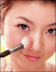 4.颧骨附近涂上腮红:选择颜色略深的腮红,不但能提升肌肤的红润度,还能收紧脸形。沿着颧骨方向以打圈的方式涂匀腮红。