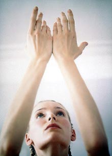 双手掌交错在耳边,向上延伸用力,静止2—3秒后放松。共进行5—10次。